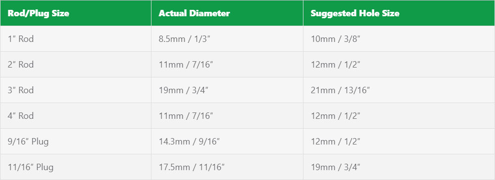 The optimal treatment hole is just larger than the rod itself, keeping the rod in close proximity to the hole surface while maintaining easy installation. When using the Genics Cobra Plugs the treatment hole should be 1/16″ smaller than the plug size being used. Refer to the chart below when selecting the best drill size.