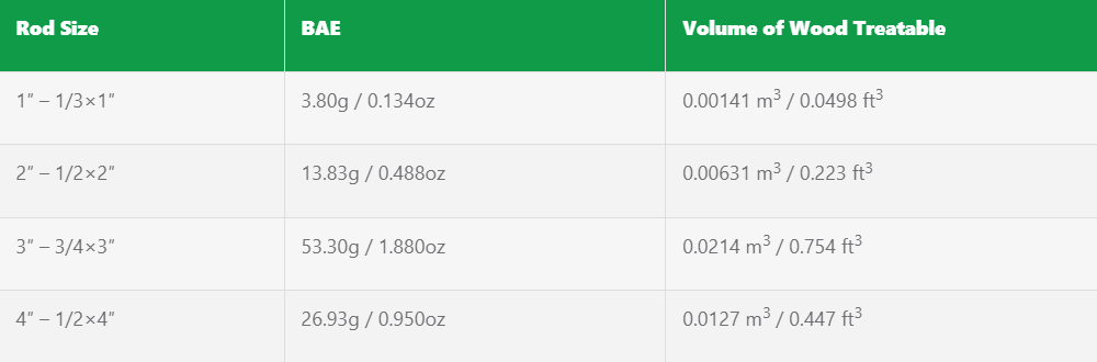 The second consideration is the volume of wood to be treated. Each rod contains a certain amount of material and has a Boric Acid Equivalent (BAE). In order to effectively protect wood, a loading of at least 2.0 Kg/m3 (2oz/cu ft) is recommended. The simplest way is to first calculate the volume of wood you wish to protect. Then, using the chart below, divide by the appropriate size’s treatable wood volume to find the total number of rods required. In cases where existing decay is present, the load rate should be tripled.